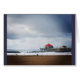 Un matin d'hiver orageux à Huntington Beach, Californie du Sud. Vue sur le Ruby's Diner au bout de la jetée, ombre de l'île Catalina au loin, et de grandes vagues qui en font un spot de surf populaire.