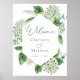 Bienvenue à votre mariage avec cette belle affiche, avec hydrangée aquarelle, eucalyptus et cadre doré. Ajoutez les noms du couple et la date du mariage à l'aide des champs fournis.