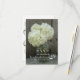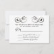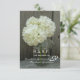 Un rsvp de mariage avec une photo d'un bocal d'hydrangées blanches sur un fond de bois d'écorce sur le devant. Texte blanc. Côté opposé, le texte est gris foncé. Recherchez les invitations correspondantes chez Jill's Paperie.