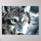 Poster présentant le loup hypnotique de l'artiste animalière Michaeline McDonald d'un portrait rapproché des yeux d'un loup peint dans les tons bleus. Copyright de l'oeuvre © Michaeline McDonald. Visitez mon site web officiel à www.wisetailsart.com .