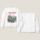 This fun shirt is perfect for all those boys and girls who love dinosaurs. Santa is riding in his sleigh pulled by two Tyrranosaurus Rex dinosaurs. One dinosaus is wearing a Santa hat and another has a scarf wrapped around his head and neck. A beautiful forest is behind them.