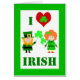 I Heart / Love Irish, carte de voeux papier St. Patrick's Day. Les mignons personnages tenant du shamrock sont habillés en leprechaun et en irlandais avec des cheveux oranges et une robe pointillée de polka. Un coeur rouge avec un shamrock à l'intérieur est en haut de la carte. Diverses teintes de vert sont utilisées pour un look irlandais heureux. Personnages avec l'aimable autorisation : Clker. Copyright © Shoaff Ballanger Studios.
