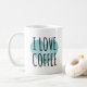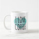 Ce design de tasse simple et mignon comporte les mots "I Love Coffee" sur un coeur de couleur aqua. Le cadeau parfait pour ce buveur de café spécial dans votre vie!