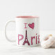 Tasse à café élégante avec un texte graphique noir en contour rose lisant Paris, avec la lettre a fait comme une tour Eiffel rose et noire damassé. Un coeur rose à contour noir, au-dessus, a une lettre rose I avant lui. Super mug pour la maison ou le bureau et fait une excellente idée cadeau.