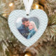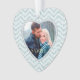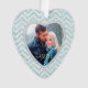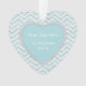Votre propre photo est présentée dans un cadre en forme de coeur sur ce joli ornement de Noël de gardien. Le cadre est placé sur un arrière - plan motif bleu aqua glacé chevron. Le dos de l'ornement a le même arrière - plan et le même cadre, avec votre texte personnalisé en blanc sur un arrière - plan solide correspondant. Lumineux, élégant et personnalisé pour vous ! *Remarque : l'image est imprimée et ne contient aucune parties scintillant réelle.