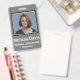 badge d'identification de l'employé dans la conception verticale classique. Arrière - plan gris acier. Tous les éléments sont modifiables ou amovibles. Les éléments comprennent : photo de l'employé, nom de l'employé, nom de l'entreprise, service de l'employé. Le dos de la conception a la sécurité code barre numérisation. Assieds-toi au sommet pour le lanyard.