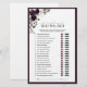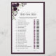 Il Dit She Said Plum Purple Floral Fête des mariées Game Ajouter l'élégance et le rire à votre douche nuptiale avec la Bourgogne & Plum Floral "Who Was First" Il Dit She Said Game Card. Ce design sophistiqué présente des fleurs d'aquarelle bordeaux, prunes et rousses associées à une végétation riche, le tout encadré par une bordure de couleur vin. Les clients pourront deviner quel partenaire a été le "premier" dans les étapes mémorables de la relation en encerclant les lèvres de prune ou les moustaches de charbon, ce qui en fait une activité attrayante et légère pour tout le monde. Copyright Anastasia Surridge, tous droits réservés.