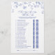 Blue Floral He Said She Said Game Card Apportez le rire et le plaisir à votre fête avec cette carte de jeu florale bleue "He Said She Said - Who Was First". Les invités encerclent leurs réponses pour deviner qui a dit ou a fait chaque jalon d'abord, du premier baiser à la planification des nuits de date. Décoré d'élégantes illustrations florales bleues dessinées à la main et d'icônes assorties, ce design ajoute une touche de charme intemporel aux mariages, aux douches nuptiales ou aux fiançailles. Un brise-glace parfait et gardez le saké pour le couple heureux. Copyright Anastasia Surridge, tous droits réservés.