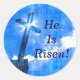 Image d'art original d'une croix d'église avec un effet d'éclatement d'étoile sur le ciel bleu avec le texte "Il est ressuscité!". Cette version est tout en tons bleus avec des nuages blancs. Modifiez facilement le texte pour le personnaliser. Un autocollant inspirant pour Pâques et à tout moment de l'année.