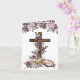 Cette carte de Pâques présente un graphique d'une croix ornée de fleurs violettes avec une Bible ouverte posée à la base. Il y a un verset d'écriture à l'intérieur à gauche. Il y a du rose et du violet rosé le long du sommet. L'intérieur a un message d'accueil : "Il est ressuscité" "Joyeux Jour de la Résurrection. Vous pouvez personnaliser avec vos noms.