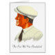 Le texte est personnalisable. Un monsieur débonnaire et pimpant dans des blancs sportifs utilisant un casquette ou un béret. D'une vieille publicité française de magasin de casquette.