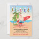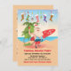 Super fun Tropical Beach thème de Fêtes de Noël invitation avec Père Noël prêt à Surf, palmier et pendre les bas de Noël, le tout sur une plage arrière - plan de l'océan.