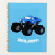 Ce mignon camion monstre bleu est prêt pour l'action de course. Camionneur de course haute octane amusant dessiné dans le style de dessin animé heureux!