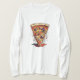 Imaginez une illustration ludique, de style dessin animé, d'une tranche de pizza conçue pour un t-shirt. La tranche de pizza a des couleurs vives et audacieuses, avec du goey, fondu du fromage qui jaillit des bords. La croûte est brun-doré avec une légère texture, et elle est légèrement inclinée pour donner à la tranche un aspect amusant et dynamique. Les garnitures sont ludiques et exagérées — de grosses tranches de pepperoni rond, des poivrons verts et des champignons, le tout ajoutant une pop de couleur. Le visage de la tranche de pizza est caricatural, avec de grands yeux expressifs et un large et gai sourire. Peut-être qu’il donne même un coup de pouce ou un coup de pouce, ajoutant un sentiment de personnalité et de fantaisie au design. L'arrière - plan est simple, peut-être juste une couleur claire ou un éclat de rouge ou jaune vif pour faire ressortir la tranche de pizza. Le design pourrait avoir un contour audacieux, le rendant parfait pour un t-shirt — quelque chose de amusant et attrayant pour les amateurs de pizza!