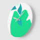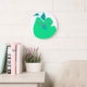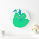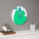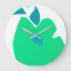 Cette horloge murale arrière - plan blanche a une illustration en forme de poire verte et de centre bleu triangulaire.