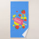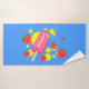 Serviette de bain avec un thème estival. Conçu avec du popsicle rose et quelques fraises rouges qui tombent autour du popsicle avec quelques éclaboussures de peinture jaune. Arrière - plan bleu.