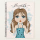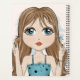 Une super mignonne fille faisant des gestes de symbole de signe de paix avec ses doigts. Belle image de brune aux cheveux longs aux yeux bleus avec une aquarelle arrière - plan nuages bleus éclaboussant. Une partie de ma série de dessins d'art fantaisiste de Beaux Grands yeux. Idéal pour répandre espoir, harmonie, pouvoir des filles, liberté, amitié, accueil amical, acceptation, calme, shalom, etc. Illustration dessinée à la main par Donna Leger.
