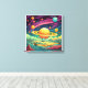 Cette image surréaliste représente une scène extraterrestre fantastique et vibrante. Une grande planète aux cercles orange et jaune est au centre, suspendue au-dessus d'un lac tranquille qui reflète les couleurs du ciel. Les cieux sont une galaxie tourbillonnante d'étoiles brillantes, de nébuleuses et de nombreuses autres planètes et lunes dans différentes nuances d'orange, de jaune, de bleu et de vert. Le paysage en contrebas est tout aussi imaginatif, avec des collines ondulantes et d'étranges formations, dans une palette époustouflante de bleus, roses et verts. La surface de l'eau reflète le ciel vif et les objets cosmiques, créant une composition harmonieuse et onirique. Le style général est capricieux et, à l'inverse, mêle beauté cosmique et paysage alien.