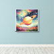 Cette image est une représentation artistique et colorée d'un Saturne stylisé. La planète, un mélange frappant de teintes orange et jaune, domine le centre du cadre, encerclé par ses anneaux proéminents. Au-dessous de la planète se trouve un paysage vallonné et vibrant, peint dans un arc-en-ciel de couleurs pastel, dont les roses, les violets et le blues, qui crée une vue d'un autre monde. Le ciel au-dessus est une riche tapisserie de bleu profond et de violet, parsemée d'étoiles scintillantes et de planètes lointaines, ajoutant à l'atmosphère magique. Le style d'ensemble évoque un tableau onirique psychédélique, aux lignes fluides et douces et à la palette de couleurs audacieuses.