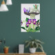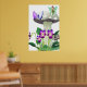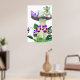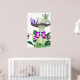 Poster d'une petite fée aux ailes vertes, assis au-dessus d'un grand champignon tacheté, accompagné d'un papillon violet. Ci-dessous, des fleurs violettes vibrantes et des feuilles verdoyants ajoutent de la couleur à la scène fantaisiste.
