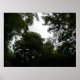 Cette belle impression présente une photo prise à l'intérieur d'une forêt dense. La photo montre l'obscurité des arbres et une petite zone de ciel gris. Le résultat est une scène étrange et atmosphérique.