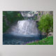 L'eau moussante tombe dans le bassin profond et alimente un ruisseau de montagne rocheux. L'herbe et la bruyère adoucissent les parois rocheuses qui ombragent les chutes, avec des plaques de neige montrant qu'il fait encore froid en ce jour de printemps. À côté du bassin se dresse un arbre avec une balançoire en bois suspendue à ses branches. Les digitales de printemps et les bleuetes parsèment les berges herbeuses, et des rayons de soleil scintillent dans la bruine.