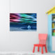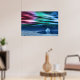 Dans la baie d'une terre gelée, un grand iceberg flotte dans la mer bleue froide. Les flocons de neige et les étoiles scintillent la scène, et dans le ciel, les aurores brillent dans les tons rose, lavande, vert et bleu.