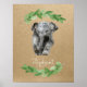 Jolie impression d'éléphant, parfaitement neutre avec un fond marron kraft, de la verdure aquarelle et du texte en calligraphie blanche.