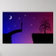 Dessin d'un homme debout en silhouette sur un pont cassé, regardant à travers le golfe où se trouve un arbre à saule solitaire. Dans le ciel derrière lui se trouve la lune et les étoiles dans un ciel bleu foncé, qui s'estompe vers le rouge à l'extrémité pour le début du lever du soleil. Illustration des émotions de l'espoir, du désespoir et de la solitude à mesure qu'il atteint le bout du chemin et trouve le chemin impraticable.