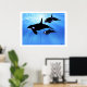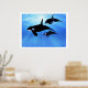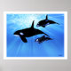 Deux épaulards femelles et un mâle chassent ensemble dans un bel océan limpide.