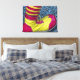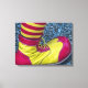 Une belle photo d'une chaussure de clown jaune et rouge et d'une chaussette assortie imprimée sur une toile.
