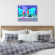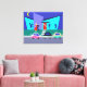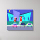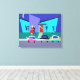 Cette Retro Open House Party Stretched Canvas Print vous mettra dans l'humeur de fête. Le dessin animé présente l'extérieur d'une maison moderne du milieu du siècle. Du sol au plafond, des murs en verre turquoise permettent de voir les silhouettes bleu marine des fêtards. Il y a un couple qui bavarde devant une fenêtre. De l'autre côté de la pièce, on voit un homme dansant et l'homme à longs vents que tout le monde essaie d'éviter. L'extérieur de la maison comporte une porte rouge gaie et une cheminée en brique violette surdimensionnée. Une passerelle grise coupe une bande jusqu'à la porte d'entrée, à travers l'herbe turquoise. La scène nocturne a un ciel bleu foncé avec une lune jaune croissant. Un beau couple fait le cha-cha-cha sur le chemin de leur voiture. La femme blonde porte une robe rouge vif. Sa belle escorte porte un costume noir et une cravate rouge. Ses mains sont enveloppées autour de la taille de la femme. Dans la rue, devant la maison, on peut voir trois voitures classiques aux couleurs vives. Commandez aujourd'hui et faites la fête comme en 1959 !