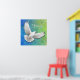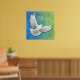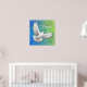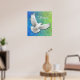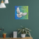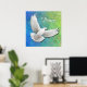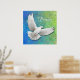 Design d'art original d'une colombe blanche volante contre un bel arrière - plan bleu vert par l'artiste Carolyn McFann de Two Purring Cats Studio imprimé sur une affiche de qualité.