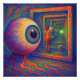 "A travers le prisme de la vue". Baignée par des vagues aux couleurs vives d'orange, de rouge et de bleu, une femme se tient pieds nus au bord d'un tunnel miroir infini. Les yeux colossaux regardent en arrière sans fin, leurs réflexions s'étendant au-delà de la vue dans le futur. Un oeil plus petit et mal placé repose sur le sol, rappelant discrètement que la perception n'est jamais impeccable, et que chaque vision comporte ses propres distorsions.