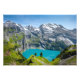 Photo print of the turquoise Oeschinensee lake, surrounded by high alpine mountains on a summer day in the Alps, high above Kandersteg in Bernese Oberland, Switzerland.
