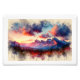 Dramatic clouds hover over jagged mountain peaks illuminated by a vibrant sunset. Forested foothills are painted in deep reds and purples.