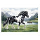 Brana at a different angle, she was a silver black pinto but painted her as black and white Icelandic horse that walks across a grassy field, with a serene backdrop of mountains and a river. A Viking ship is docked near a rustic cabin.