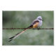 Capteur à ciseaux perché sur une clôture en fil de fer barbelé. Les oiseaux adultes ont des têtes et des parties supérieures gris pâle, des parties inférieures lumineuses, des flancs et des couvertures sous-arrière rose saumon et des ailes gris foncé. Les axes et les taches sur les revêtements sous-marins sont rouges. Leurs queues extrêmement longues et fourrées, qui sont noires sur le dessus et blanches sur le dessous, sont caractéristiques et indéniables. À maturité, le mâle peut avoir une longueur de 15 po (38 cm), tandis que la queue de la femelle est jusqu'à 30 % plus courte. L'envergure est de 15 cm (5,9 po) et le poids peut atteindre 43 g (1,5 oz). Les oiseaux immatures sont de couleur plus pâle et ont des queues plus courtes. Beaucoup de ces oiseaux ont été signalés à plus de 40 cm (16 po).