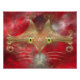 Un visage de chat stylisé fait de courbes et de courbes dorées, avec de grands yeux vert-or, contre un arrière - plan fractal rouge.