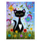 Un chat smoking noir et blanc assis parmi l'herbe et les fleurs dans un jardin coloré. Autour d'elle se trouvent des fleurs et des feuilles et des formes colorées. Elle a les plus beaux yeux verts et porte un collier rouge.