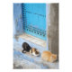 Chats nappés à la porte d'un des célèbres bâtiments bleus de Chefchaouen, Maroc.