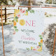 Affiche de bienvenue d'anniversaire Pink Floral Citrus 1st Birthday Floral and citrus girl's premier anniversaire signe de bienvenue avec quelques citrons, orange, fleurs et feuillage arrangements et faux points d'or.