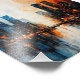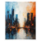 Une peinture expressionniste vibrante et abstraite d'un paysage urbain moderne la nuit. L'image est scindée, contrastant les bleus cool et blancs sur la gauche avec des oranges chaudes et des rouges enflammés sur la droite. De grands gratte-ciel sombres se reflètent dans l'eau en contrebas, mis en évidence par les fenêtres lumineuses et électriques et le changement spectaculaire de couleur au-dessus. La technique de l'impasto donne à la peinture une sensation dynamique et texturée.