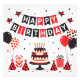 Cute happy birthday ladybug theme. Red, black and white design with balloons, paper hats, gift boxes and cake.