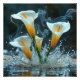 Des lys calla délicats aux pétales blancs et spadices orange vibrant, émergeant d'une surface d'eau sereine. Alors que l'eau éclabousse autour d'eux, des gouttelettes s'accrochent aux fleurs, ajoutant un aspect frais et vibrant. Des volutes de vapeur ou de brume tourbillonnent autour des fleurs, renforçant la qualité éthérée de la scène. L'arrière-plan présente une tonalité douce et atténuée, ce qui contribue à mettre en valeur la beauté et la clarté des fleurs et le mouvement dynamique de l'eau. Globalement, la composition évoque un sentiment de tranquillité et d'élégance.