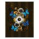 Composition de l'horloge ronde steampunk avec cadran romain noir, décoré avec des engrenages or et laiton, papillons Morpho bleu et lentilles endommagées sur arrière - plan rayé brun. Style Steampunk.