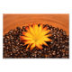 Tissu avec une photo dans les tons chauds avec des fèves de café et une marguerite jaune teintée d'orange sur un arrière - plan en bois.