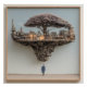 A colossal tree heavy with soft lavender-pink blossoms floats impossibly above a barren desert, its massive root system supporting an entire miniature ruined city of concrete factories, smokestacks, warehouses, and skeletal scaffolding. A lone figure in a blue coat and fedora stands tiny on the cracked ground below, gazing upward in quiet reverence. The scene blends melancholy grandeur, nature’s quiet triumph over decay, human fragility, wonder, and metaphysical mystery—perfect for meditation rooms, moody bedrooms, home offices, therapy spaces, dark-fantasy decor, or as deeply evocative gifts for dreamers, philosophers, surreal-art lovers, spiritual seekers, or anyone drawn to atmospheric depth and impossible beauty.