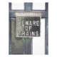 Un design artistique de la vieille porte du bureau de réservation sur la plate-forme de la gare avec un avertissement de non entrée et de se méfier des trains de l'époque du train à vapeur.