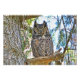 Photo d'un grand hibou à cornes qui regarde la caméra. Le hibou est assis sur une grande branche d'arbre à feuillage persistant pour que ses énormes griffes se manifestent très clairement. Il a l'air un peu croisé. Cette image de hibou peut être facilement customisée avec votre propre texte et imprimé sur de nombreux produits différents. C'est une photo d'une chouette à grande corne sauvage dans son environnement naturel.